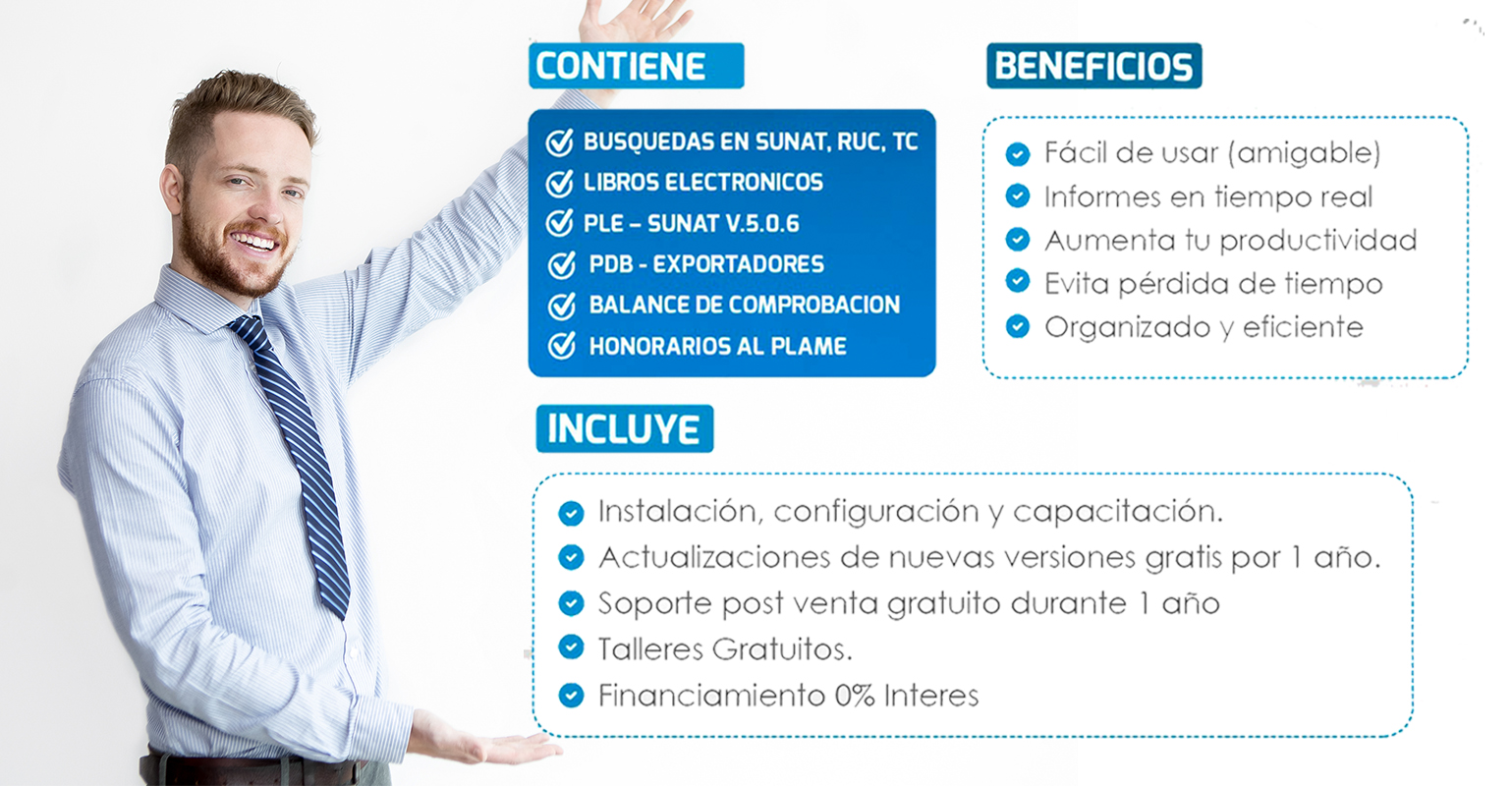 - Ventas: Registro de Clientes, Boletas, Facturación, Notas de Crédito, Notas de Débito, otros.