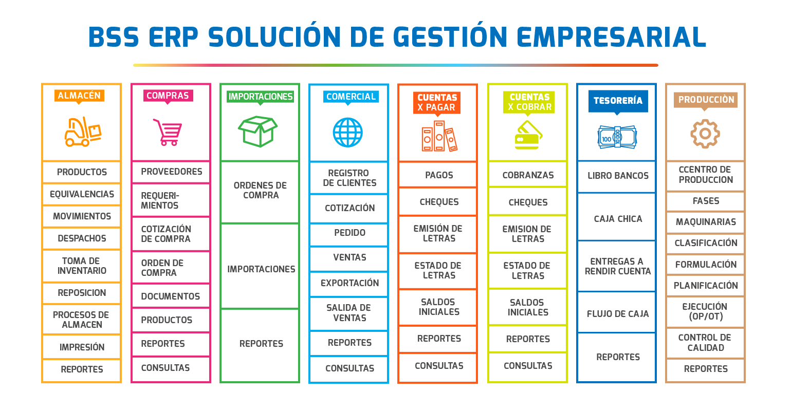 - Reportes de Módulos y Gerenciales: Reportes de almacenes, compras, ventas, Reportes Gerenciales, otros.
